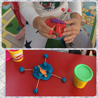 STEM entegrasyonu kısmında ise çocuklar oyun hamuru ve kürdan ile tasarımlarını gerçekleştirdiler: hayvanlar için bir kapta yemek tasarladılar,barınak tasarladılar,tehlikelerden korunmak için çadır tasarladılar,korunmak için yerler tasarladılar,jet araba tasarladılar :